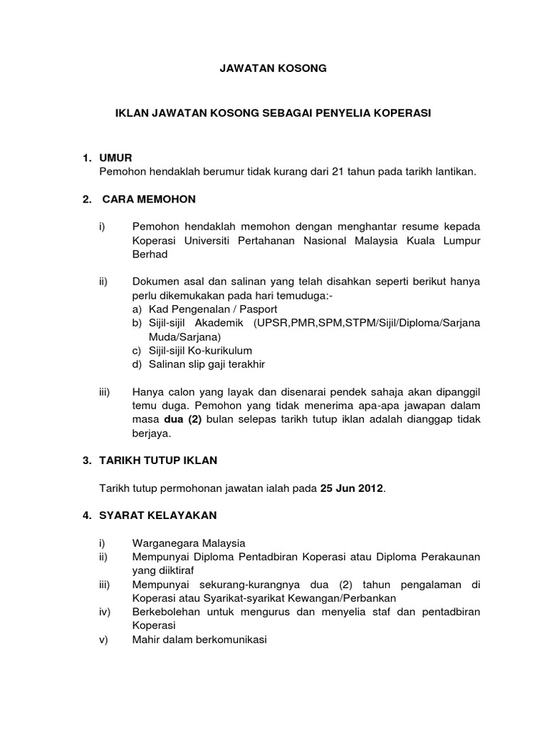 Contoh Jawatan Kosong Koperasi