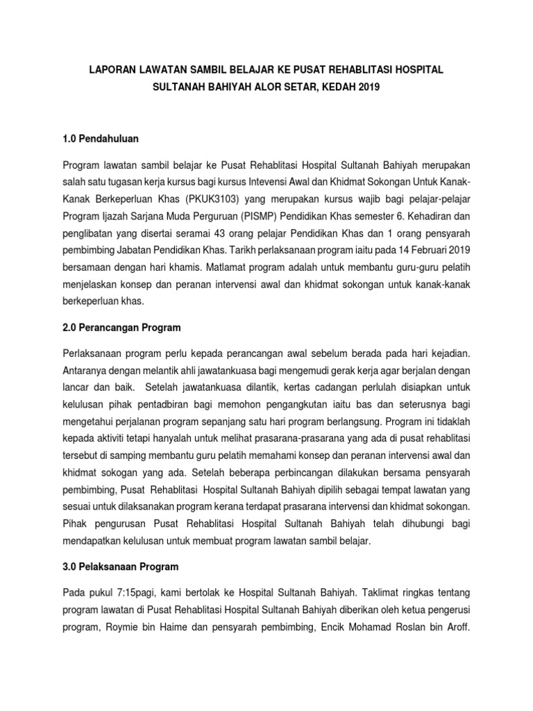 Laporan Lawatan Sambil Belajar Ke Pusat Rehablitasi Hospital Sultanah Bahiyah Alor Setar